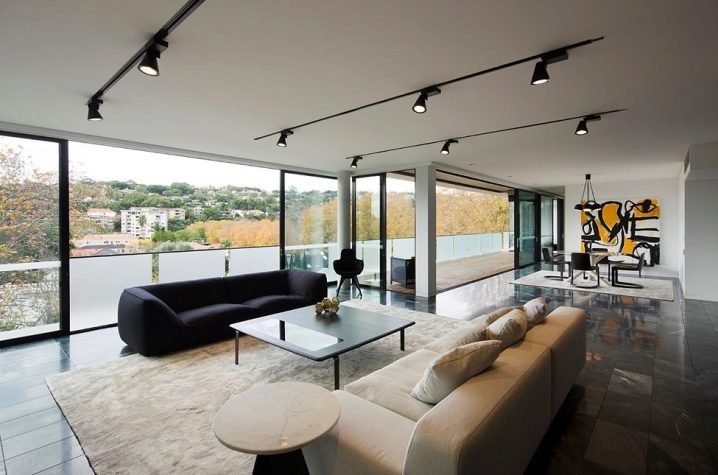 Модерни минималистичен интериорът, функционален и поддържан в тясна гама от цветове, ще бъде допълнен от лампи с непрозрачни или матови нюанси в интериорния цвят. А възможността за промяна на посоката на светлинния поток ще бъде практично допълнение.