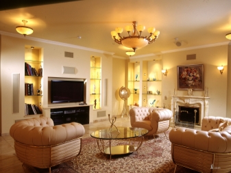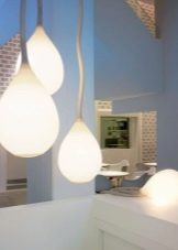 - Окачен (с помощта на полилей). Това е най -често срещаният вариант, поради факта, че поради особеностите на строителните технологии имаше само един изход за осветителни тела на тавана. По правило се намираше в центъра. Този вид опция се използва и днес, тъй като помага да се избегнат материални разходи. Съвременният полилей може да има не една, а няколко лампи и да има доста оригинална форма. Въпреки че тази опция е консервативна, тя все още остава най -популярната и достъпна..