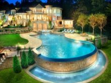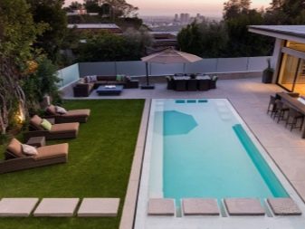 Басейнът може да служи като независим елемент на декора през нощта: можете да инсталирате осветление в него, което ще го отличи на фона на други елементи на ландшафтен дизайн. Освен това можете да правите партита на вилата и да се забавлявате с приятели..