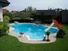 Що се отнася до местоположението на басейна, тогава в лятна вила обикновено се инсталира близо до къщата. Това се дължи на факта, че всички комуникации трябва да достигат до там, за да може да се изтегля вода.