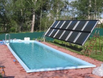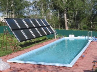 На вилите можете да оборудвате най -икономичния вариант за отопление на басейна – слънчев колектор, който изобщо не изисква разходи за електроенергия. Но недостатъкът на такива системи е, че водата в басейна може да се затопли само в слънчев летен ден. Колекторите са изградени от плоски сегменти, направени от малки черни полипропиленови тръби. Именно в тях водата се нагрява от слънчева радиация..