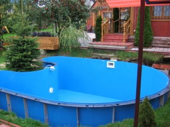 Рамковият басейн обикновено е кръгъл, но има и квадратни модели. Рамковите басейни, изработени от пластмаса, имат ярък и необичаен дизайн, такъв елемент може да се превърне в акцент на вашата лятна вила. Но продуктите с метална рамка изглеждат по -прости и неусложнени..