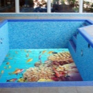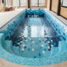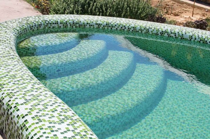 Най -красивият и пъстър вариант са басейните, декорирани с мозаечни плочки. При облицовката им се използват плочки с нисък процент водопоглъщане. По този начин плочките се полагат както вътре в басейна, така и отстрани. По правило дълбоките модели са подрязани към него. Плочките са избрани не едноцветни. Тя може да бъде комбинация от различни нюанси на синьо и синьо. По този начин можете да направите красиви преливания и да украсите басейна по -ярко..