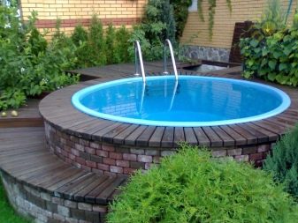 Някои хора предпочитат да завършат басейна с дървени дъски. Те се инсталират както в дълбоки басейни, така и като подиум близо до рамкови модели. Някои модели са облицовани с тухли. Тази опция за довършителни работи е идеална, ако всички конструкции във вашата лятна вила са изработени от подобни материали. В допълнение, това ще бъде издръжлив и красив дизайн..