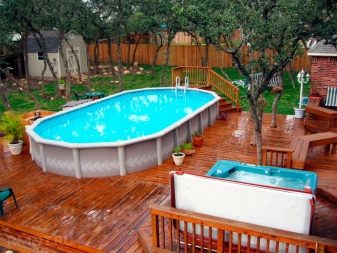 Цената на този дизайн е средна. Те са по -скъпи от надуваемите варианти, но по -евтини от потопените модели. Такъв басейн е идеален за средна или голяма крайградска зона. Но в малка градина тя ще изглежда твърде масивна..