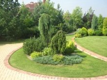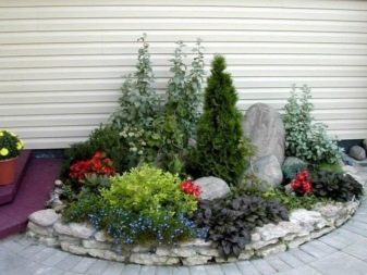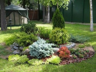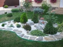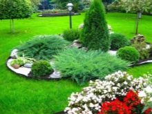 Много интересен вариант би бил декорирането на цветното легло с предимно иглолистни видове растения. Процесът на създаване на такава условна цветна градина (в края на краищата няма цветя на иглолистни дървета) не е твърде различен от счупването на обикновена цветна леха.