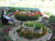 Но ако градинарят вече има опит в подреждането на най -простите цветни лехи и иска да разнообрази пейзажа на лятната вила, която отдавна е скучна, тогава идва времето за всякакви експерименти. Едностепенна цветна леха може да бъде заменена с цветна леха на много нива, украсена например с фонтан или изкуствен резервоар.