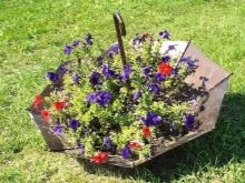 Струва си да разгледаме по -отблизо съдържанието на килера или тавана, където се съхраняват стари и ненужни неща. В допълнение към вече споменатите цветни лехи, направени от гуми, на напълно неочаквани места могат да се поставят интересни цветни лехи..