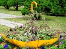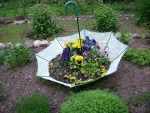 Например, цветни лехи-чадъри. На пръв поглед това е нещо напълно невъзможно, но си струва да покриете чадъра с нетоксична армировка, да направите няколко дупки за излизане на вода и необичайна цветна леха е готова.!