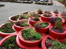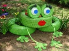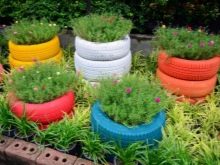 Цветни лехи от гуми – това е твърде интересен и обещаващ вариант за цветна градина, за да не кажа още няколко думи за това. Лебедите се изрязват от внимателно измити и боядисани гуми и се създават невероятни композиции. Достатъчно е да поставите няколко гуми една върху друга, да изградите „дръжка“ от стар маркуч и да боядисате всичко в ярки цветове – получавате сладка „чаша“, която може да бъде засадена с каквито растения харесвате. По този начин ще бъде възможно да се събере пълноценен сервиз за чай на сайта: направете “чайник” и още няколко чаши на същия принцип.