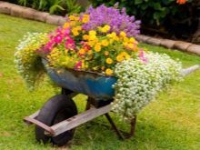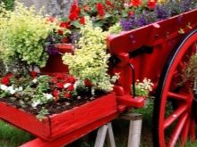 Ако на мястото остане стара градинска количка, нищо не ви пречи да я нарисувате и да я превърнете в оригинална и красива цветна леха. Същото важи и за остарялото обзавеждане (стари столове и нощни шкафчета). Понякога успяват да счупят малка цветна леха дори в стари ботуши и обувки..