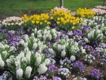 Друг интересен вариант е коритото на реката. Избирайки правилните цветя при засаждането, можете да постигнете абсолютно невероятен ефект. Ярко синият или синкав мускари, засаден с плътен килим, проектиран да наподобява поток по форма и дължина, ще създаде ефекта на водна повърхност: люлеейки се под порив на вятъра, те ще създадат илюзията за течаща вода. За украсата на “бреговете” би било по -добре да изберете ярки лалета. На сайта ще бъде необходимо да се избере продълговата или богато украсена територия, по която ще „тече“ цветен „поток“, а от двете му страни се избират малки заоблени участъци, върху които ще бъдат разположени островите на лалета. Те са засадени с жълти луковици на лалета, а останалото пространство е плътно засято с мускари..