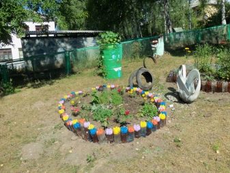 С известно количество въображение, цветна леха може да се превърне в истински шедьовър на дизайнерското изкуство. В същото време регистрацията не изисква непременно големи разходи от собственика: за много оригинални решения, използвани предмети като стар велосипед, автомобилни гуми, течаща количка или на пръв поглед идеални боклуци като пластмасови бутилки ще дойдат По-удобно..