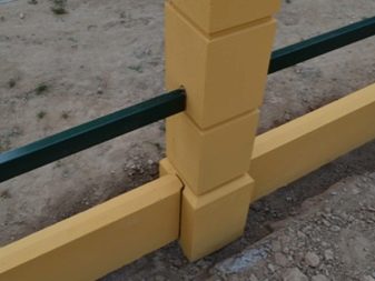 Решението е направено от пясък, камък и бетон за закрепване на основата на оградата, необходим е покривен материал за защита на канавката от разпадане и потъване на земята. Разтворът трябва да се излее върху предварително подготвен дренаж от натрошен камък, след втвърдяване да се монтира кофраж. Той ще поддържа формата и здравината на цялата структура. След това трябва да направите рамка от метални греди и армировка, което е по -малко по отношение на параметрите на кофража. Поставките за стълбове се фиксират към готовата рамка, след което се монтират бетонни плочи.