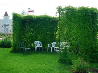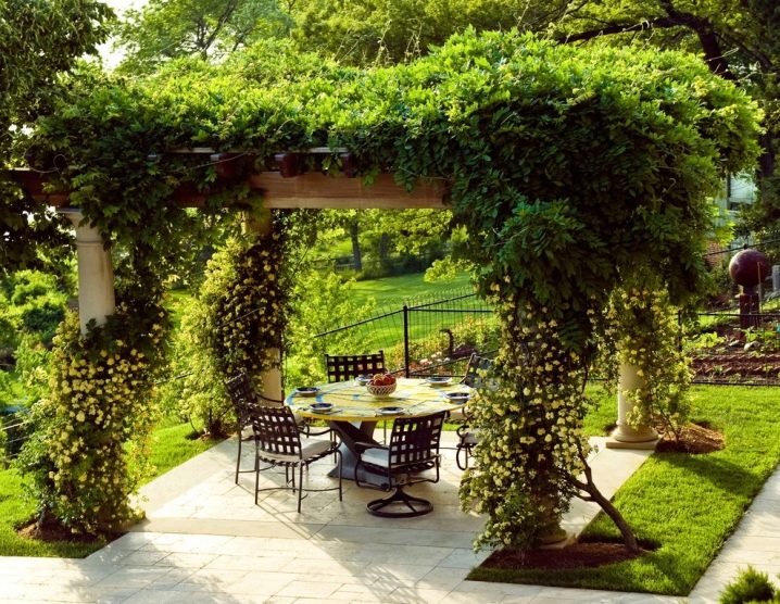 Леко засенчените участъци от перголи могат да бъдат украсени с пълзяща хортензия и актинидия.
