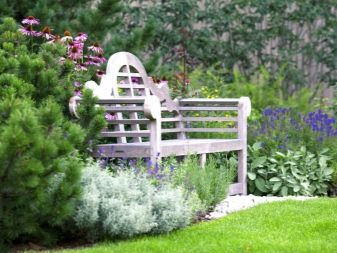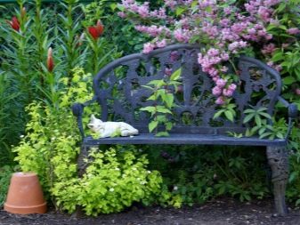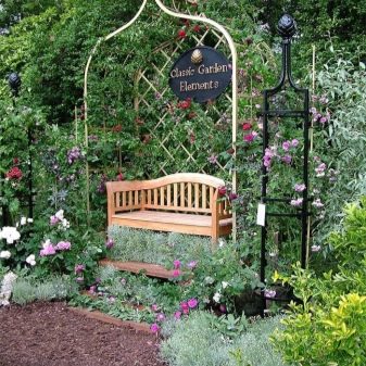 - Пейка. Този съществен пейзажен детайл, в допълнение към основната си функция, има мощен декоративен ефект. Пейките се избират в съответствие с цялостния дизайн на сайта. Най -често срещаните са изделия от дърво с елементи за коване, естествен камък и пластмаса. Издълбаните повърхности в комбинация с ажурни ковани детайли изглеждат много впечатляващи, както и напълно дървени модели.
