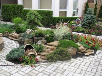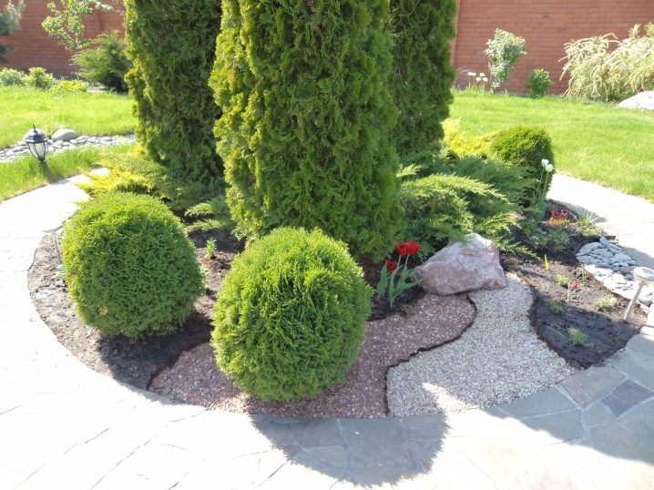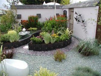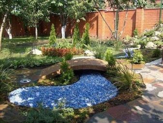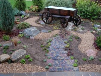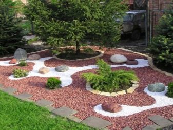 - Дъмпинг е популярен елемент от ландшафтния дизайн и може да бъде направен от декоративни стърготини, борова кора, кедрови люспи, чакъл, камъчета, каменни стърготини, черупки, пясък и изкуствени камъни. Използва се за създаване на алпинеуми, алпинеуми, изхвърляне на резервоари, образуване на пътеки и цветни лехи. Предимствата включват прост стил, наличност и дълъг експлоатационен живот на изкуствени материали. Недостатъкът на изхвърлянето е доста трудоемкото отстраняване на боклука, краткият експлоатационен живот на органични компоненти като кора, люспи и стърготини, както и необходимостта от редовно отстраняване на покълналите плевели..
