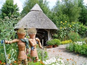 При декорирането на селски стил са подходящи триизмерни дървени фигури на птици и животни, както и скулптури от естествени материали и градински инструменти..
