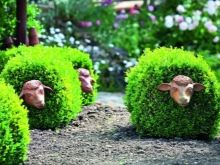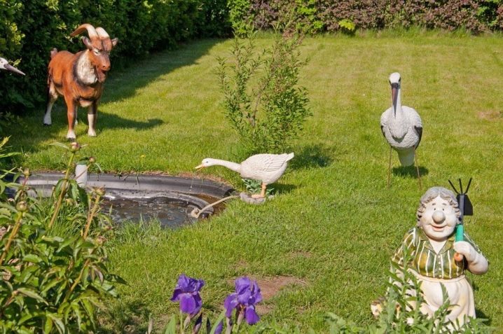 За крайградски район фигурките на животни са много подходящи (някои дори избират продукти в естествен размер). Популярни опции са куче, крава, магаре, кон. Много хора предпочитат диви животни и птици. Грациозен елен в градината ще ви накара да се почувствате като в приказна гора, красив лебед край езерото ще създаде поетично настроение. Интересна опция за дизайн е шарнирната глава на мечка или друго животно сред дърветата в градината или точно на входа на къщата..