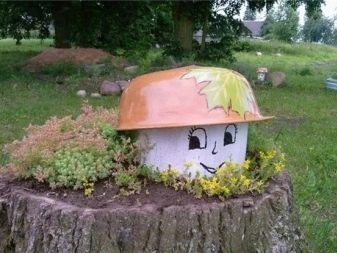 За да допълвате големи форми, можете да използвате малки елементи (като гъби). Те ще изглеждат естествено в естествената среда. Подходящ вариант са мухоморите с ярки шапки. Точно такъв е случаят, когато вредните гъби могат да бъдат полезни. Гъбата може дори да има очи: в този случай може спокойно да се нарече главният пазач на вашия сайт. На съвременните сайтове можете да видите най-различни фигурки: приказни герои, домашни любимци.
