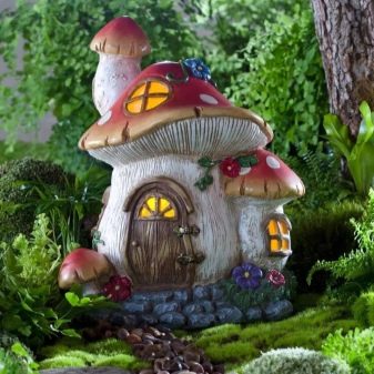 За да допълвате големи форми, можете да използвате малки елементи (като гъби). Те ще изглеждат естествено в естествената среда. Подходящ вариант са мухоморите с ярки шапки. Точно такъв е случаят, когато вредните гъби могат да бъдат полезни. Гъбата може дори да има очи: в този случай може спокойно да се нарече главният пазач на вашия сайт. На съвременните сайтове можете да видите най-различни фигурки: приказни герои, домашни любимци.