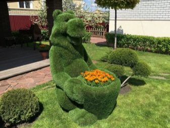 Такива произведения на изкуството изискват редовна грижа, трябва постоянно да поддържате формата на храста, в противен случай външният вид на фигурката губи своята естетика. За получаване на сложни структури се използва специална рамка. Тя ви позволява да създавате определени силуети. Формите от каркасни конструкции не изглеждат по -различни от обикновените, но се създават много по -бързо..