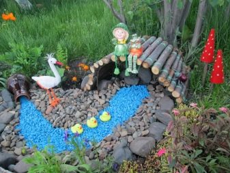 Привържениците на романтичния стил могат да използват фонтани, цветни арки. Такива зони ще бъдат украсени с лебеди, ангели. Избирайки фолклорен стил, можете напълно да изразите творчеството си. Можете сами да създавате фигури, като ги рисувате. Керамиката работи добре за тези области..