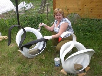 Възможно е също така да се използват импровизирани материали – например стари чорапогащи. Разбира се, такива продукти изглеждат прости. Те със сигурност не са подходящи за дворцовия стил, но ще ви развеселят и ще се превърнат в прекрасен акцент на вашия сайт. Много хора избират обикновени пластмасови бутилки, за да създават градински фигури. Продуктите могат да бъдат всякакви, най -важното е да не се бърка с избора на бои и лакове. За такива повърхности е по -добре да изберете маслени или акрилни бои..