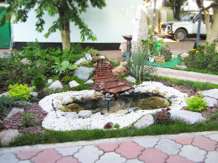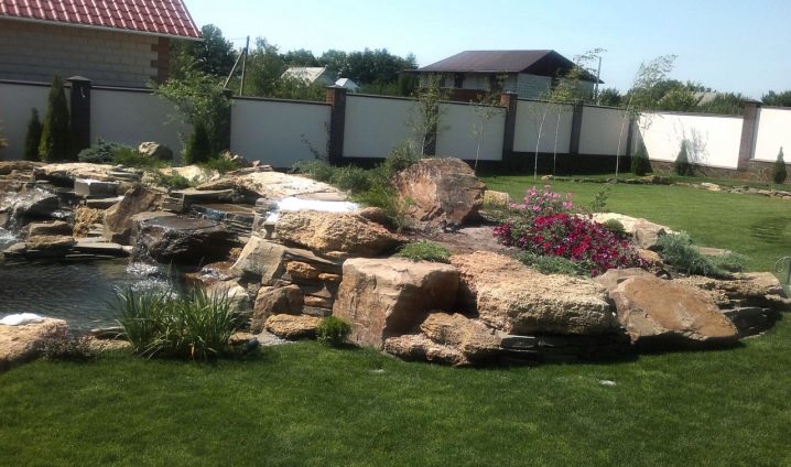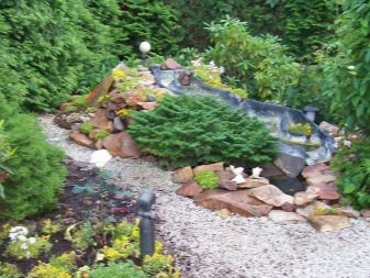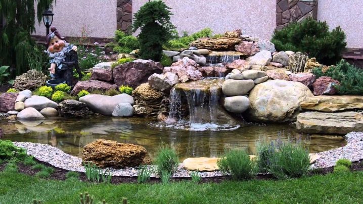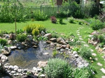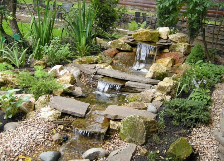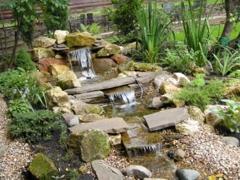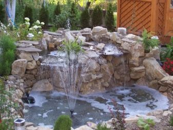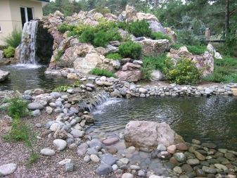 Избирайки тази опция за декор, трябва да вземете предвид, че за да оборудвате водопада, ще трябва да поставите потопяема помпа вътре в резервоара, тъй като резервоарът под налягане, който осигурява необходимото налягане на водата, не е лесен за прикриване сред растенията от алпинеуми . Освен това е важно да се вземе предвид фактът, че под директните слънчеви лъчи водата в езерото ще започне да цъфти, затова трябва да се постави на сянка. Широколистни видове храсти не трябва да се засаждат близо до водата, в противен случай резервоарът ще трябва постоянно да се почиства от листа.