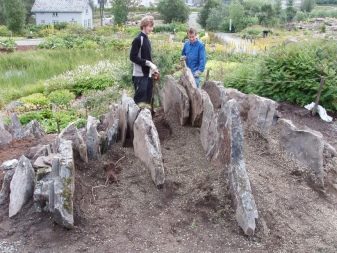 Всички неравности в релефа, било то вдлъбнатини или върхове, пътеки, тераси, се оформят ръчно. След това трябва да поставите камъните в съответствие с избрания модел плъзгач. Различни източници подчертават различни модели.