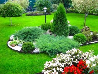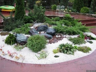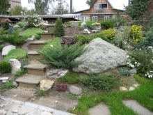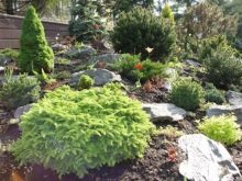 Иглолистни дървета, например хвойна, кипарис, туя – ще бъдат основата за пързалката. Скалната градина и храстите органично ще се впишат в композицията: рододендрон, метла, бадеми, боровинки.
