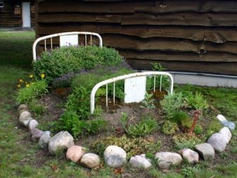 Ако собственикът разполага с малка част от градината или няма възможност да инвестира много в декорирането на алпинеума, можете да се обърнете към подръчните материали, които има във всеки гараж или килер. Счупени съдове, стари тенджери, отломки, камъни – всичко ще ви бъде от полза. Протичаща бебешка вана, ако собственикът има артистична мисъл, може да се превърне в интересен арт обект. И наличието на дупки ще помогне да се избегне необходимостта от източване на почвата. Някои занаятчии дори превръщат басейни и бани в езера в подметката на алпинеума..
