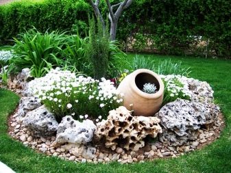 Старите ненужни гуми от автомобилните гуми могат да станат заместител на естествените материали. Те ще бъдат отлична основа за пързалка. Една гума е достатъчна за малка алпинеумна градина и ако вземете няколко, можете да оформите нива, като повдигнете основата за бъдещата терасовидна конструкция. Освен това гумите могат или да стърчат от земята, като са независима част от състава, или да бъдат скрити от любопитни очи, поддържайки го отвътре..