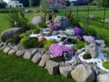 - алпийска морава е чудесен вариант за начинаещ, тя е ръчно проектирана в лятна вила, използват се малки камъни и много цветя;