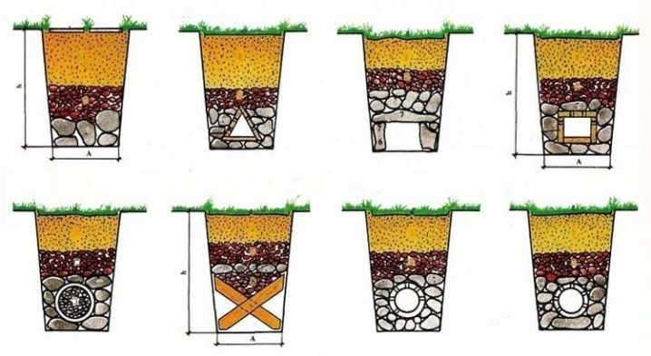 Дренажен капак е необходим за зони, които не са разположени на хълмове и натрупват излишна влага. В райони, които събират вода, се изкопават дупки с дълбочина най -малко метър. Образуваните кладенци се пълнят с дренажна “торта”: долният слой от натрошена тухла е покрит с чакъл, който е покрит с пясък. Тортата не трябва да надвишава двадесет сантиметра. След това ямите се пълнят със земя и площта се изравнява..