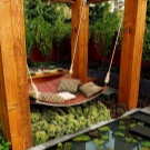 Когато декорирате парцел в провинциален стил, люлката е направена изцяло от дърво. Грубата дървесина е перфектен завършек на селски вид. Можете сами да направите такъв елемент. Важно е да не забравяте за използването на защитен състав за естествен материал..