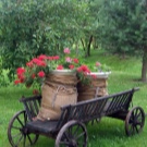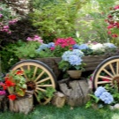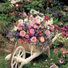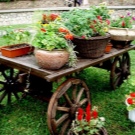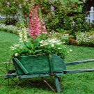 Преобърната количка с „изливащи се“ от нея растения ще бъде интересна идея. За изпълнение трябва да изберете малки цветя с много малки пъпки.
