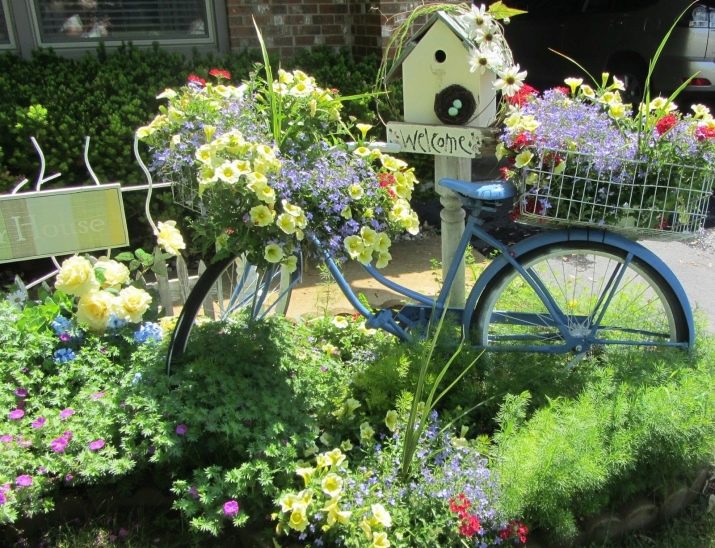 Близо до оградата може да се паркира стар велосипед. Ако го нарисувате в пастелен тон и поставите цветя в кошница, ще получите отличен атрибут в романтичен стил. Обектът може да бъде поставен до портата или да се завинтва към стената с тегло – всичко зависи от полета на въображението.