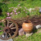 В селски стил няма ясни линии и ръбове. При декорирането на сайт в тази посока стари предмети се използват като декор, пейки от грубо дърво се поставят по периметъра, а територията е украсена с ограда от ограда от вълна. Поставянето на стари колела и стар кладенец ще добавят атмосфера в градината..