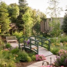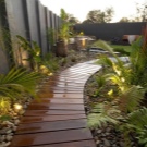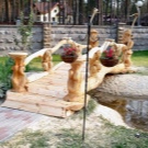 Тревата се отглежда специално по пътеките и се полагат камъни, създавайки образа на дива горска пътека. Градината е украсена с настилки. Така че покритието да не изгние при условия на висока влажност и да запази експлоатационните си свойства за дълго време, занаятчиите съветват да се замени дървото с декокиране. Този изкуствен материал е външно неразличим от естествения си аналог..