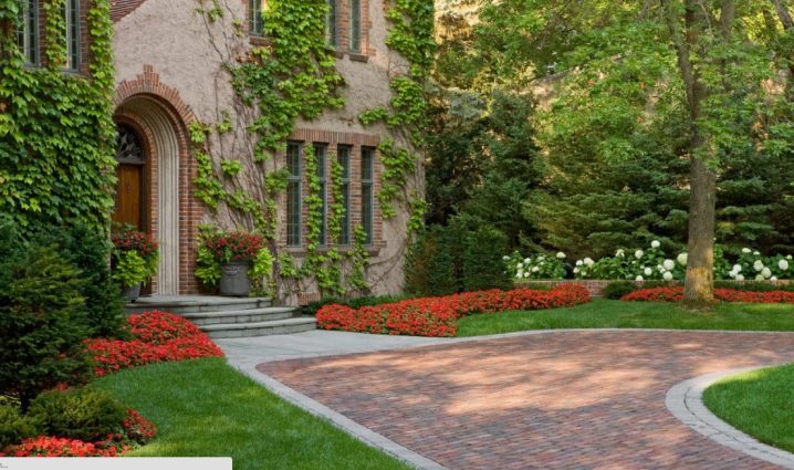 Дизайнът на имота е строг и консервативен. Грубата сива каменна настилка може да бъде разнообразна със смел цвят на акцента. Храстите на червени цветя ще бъдат отличен вариант за пейзажа на такава селска къща. Бръшлян може да се постави на стената на къщата, което ще съживи празна стена и ще я напълни с бои..