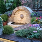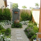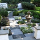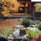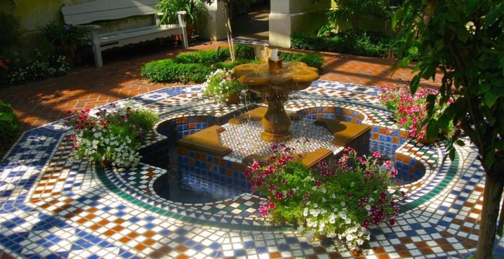 Традиционен малък фонтан, заобиколен от храсти от чемшир, е отличителна черта на ориенталския стил. По цялата територия можете да стартирате бордюр, изработен от боядисани развалини. Важно е да не забравяме, че под слоя камък трябва да има твърда почва с наклон, така че водата да не застоява.. Отводняването на водата трябва да отиде в градината.