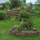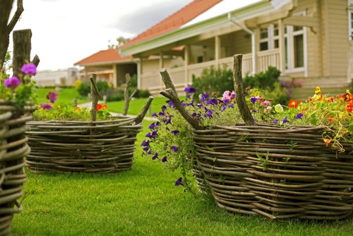 Малка жива ограда може да бъде украсена с дървени колела или атрибути в подходящ стил. Плетена обувка, подходяща за селска градина.