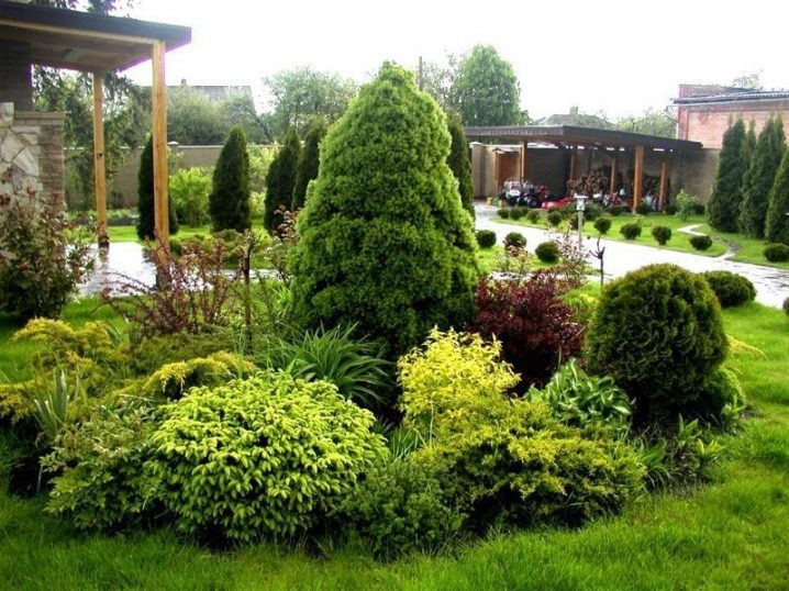 - Пейзаж. Тази опция е подходяща за тези, които предпочитат да създадат кътче от дивата природа около тях. Редуването на широколистни и иглолистни дървета ще придаде на сайта специален аромат. Дърветата трябва да изглеждат естествени и малко разхвърляни. Иглолистните растения се засаждат заедно с декоративни храсти. На фона на деликатни игли, люлякът ще създаде ярък цветен акцент.