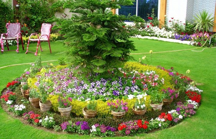Ако градината включва засаждане само на декоративни растения, тогава дизайнерите съветват да се счупи цветното легло под формата на кръг. Вътре се засаждат цветя.