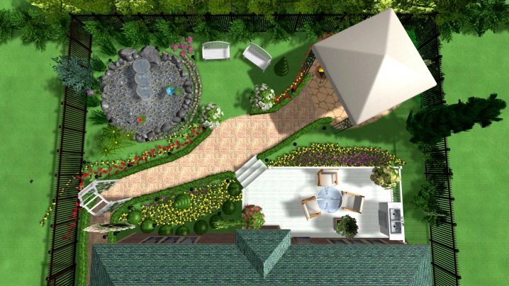 За малки площи е най -подходящо правоъгълно оформление. Важно е да поддържате баланс при поставянето на високи дървета: на територията трябва да има достатъчно естествена светлина. В противен случай ще трябва да вземете сенколюбиви растения..
