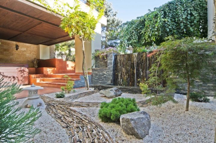 Културата на Япония и Китай е различна, но в дизайна на градинския парцел те имат много общо. Затова занаятчиите комбинираха декоративното градинарство и в двете страни, създавайки ориенталски стил. Тази посока се характеризира с използването на изобилие от чакъл и камъчета, засаждане на широколистни и иглолистни растения. Камъчетата могат да се използват за подреждане на фигури.