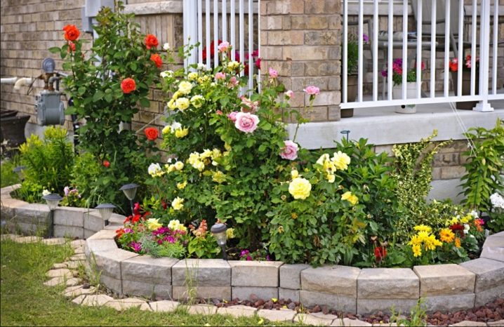 В правилния състав долният ред е съставен от маломерни сортове рози. След това се поставят средно високи и високи цветя. Завършване на композицията с иглолистни дървета, зърнени храни и папрати. Зелената морава и листата ще бъдат чудесен фон за рози..
