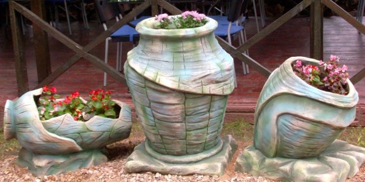 Такива продукти не са украсени с използване на лепило: под въздействието на дъжд, сняг и вятър декорът бързо ще се отдалечи от повърхността на саксията. Понякога, докато бетонът изсъхне, той се поръсва с пясък с хетерогенна структура отгоре, придавайки на повърхността грапавост и интересна текстура. След боядисване такава саксия ще изглежда стилно и необичайно. Често черупките са включени в дизайна, въпреки че трябва да бъдете изключително внимателни с този материал, в противен случай черупките могат да се напукат.