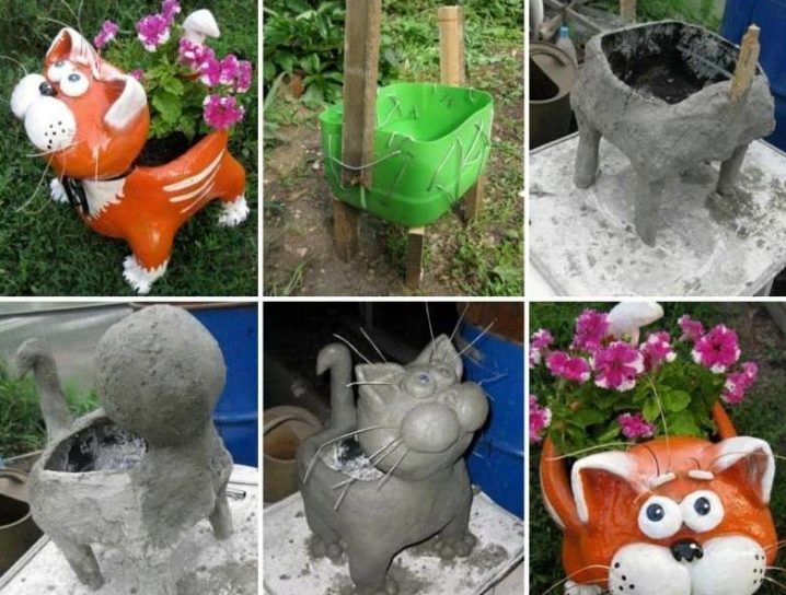 За да направите очарователна котешка саксия, ще ви трябват 6 дървени опори (могат да се използват крака от стари табуретки) и пластмасов контейнер за тялото. Подпорите са фиксирани към контейнера с помощта на алуминиева тел, от 4 за изграждане на лапи, от останалите две – опашка и глава. След това вътрешното пространство на саксията е завършено с бетон, външното пространство е изваяно. За главата може да се използва всеки кръгъл предмет..